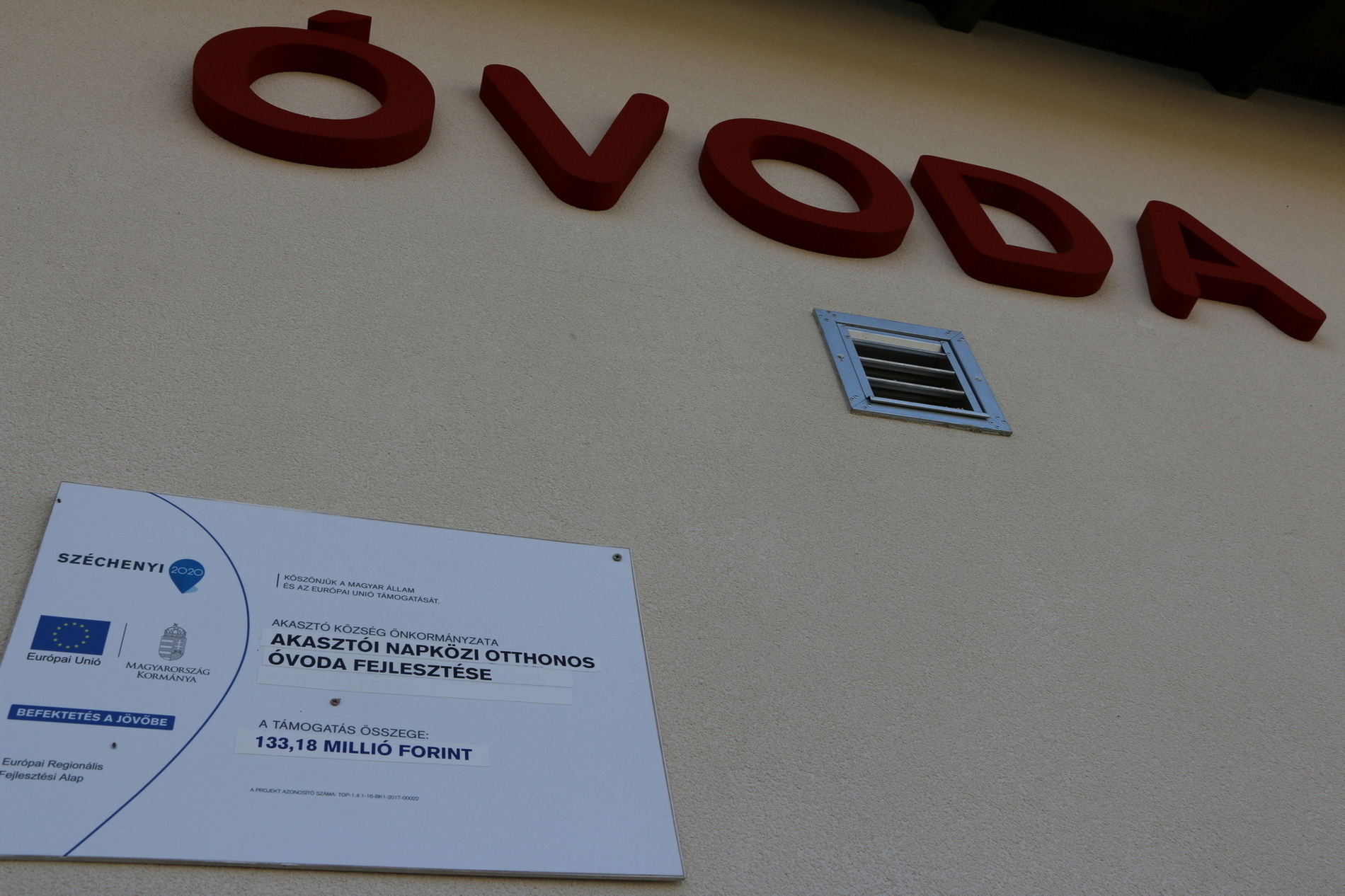 Akasztó Község Önkormányzata pályázatot nyújtott be a TOP-1.4.1-16-BK1 – A FOGLALKOZTATÁS ÉS AZ ÉLETMINŐSÉG JAVÍTÁSA CSALÁDBARÁT, MUNKÁBA ÁLLÁST SEGÍTŐ INTÉZMÉNYEK, KÖZSZOLGÁLTATÁSOK FEJLESZTÉSÉVEL című felhívásra. A 133,2 millió forintos vissza nem térítendő európai uniós forrásból egy korszerű és akadálymentes, 115 férőhelyes, 5 csoportszobás óvoda fejlesztése valósult meg felújítással és bővítéssel.
